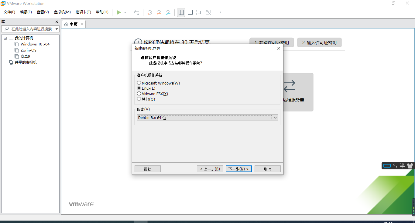 1.打开我们的VMware(我认为你安装了),然后新建虚拟机,点典型,然后找到我们的镜像,选择Linux,选择debian8x 64位,然后下一步,硬盘的话30G就可以,内存最低2G,然后运行